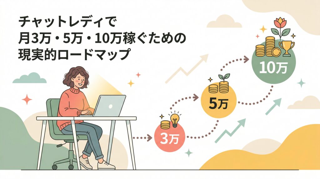 掛け持ちは「量を増やす」より「範囲を広げる」という感覚で進めると、収入の増え方が安定しやすいです。月収の目標設定と段階的なアプローチについては、チャットレディで月3万・5万・10万稼ぐための現実的ロードマップで詳しく解説しています。